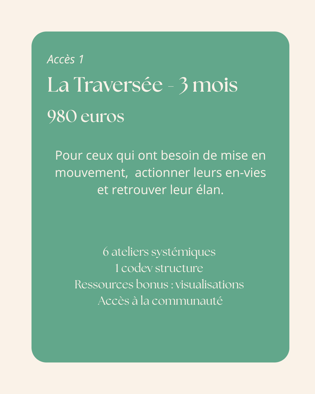 Assumez une ambition à la hauteur de ce que vous portez : ce que vous construisez dans le monde monte en impact. Pas parce que vous travaillez plus, parce que vous vous autorisez enfin à créer à votre vraie mesure. Assumez votre valeur, vos tarifs, votre façon d'être, votre vision et vos décisions. Sans vous justifier. Sans attendre la permission de quelqu'un d'autre.